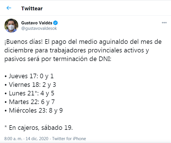 Gustavo Valdés informó a través de su cuenta oficial de Twitter, el abono del sueldo anual complementario correspondiente al mes en curso, para trabajadores provinciales activos y pasivos, por terminación de DNI.
