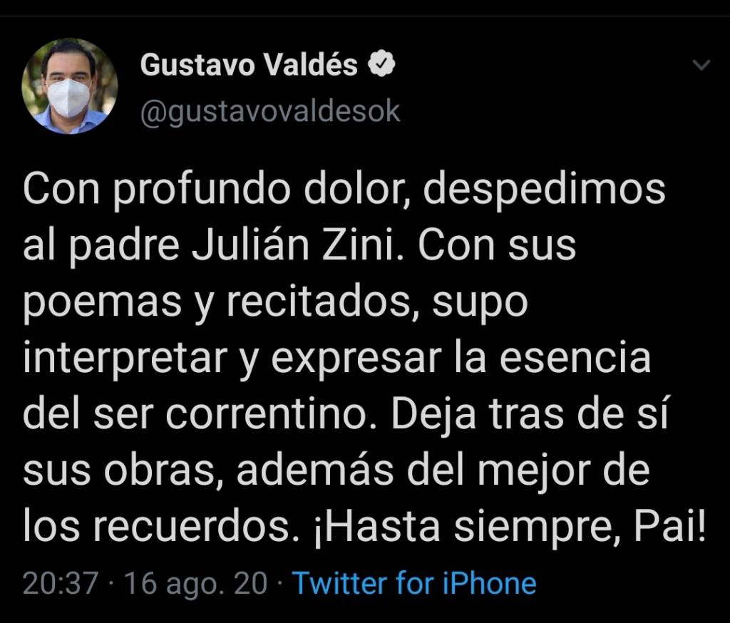 “Con profundo dolor, despedimos al padre Julián Zini. Con sus poemas y recitados, supo interpretar y expresar la esencia del ser correntino. Deja tras de sí sus obras, además del mejor de los recuerdos. ¡Hasta siempre, Paí!”, expresó el Gobernador en Twitter.