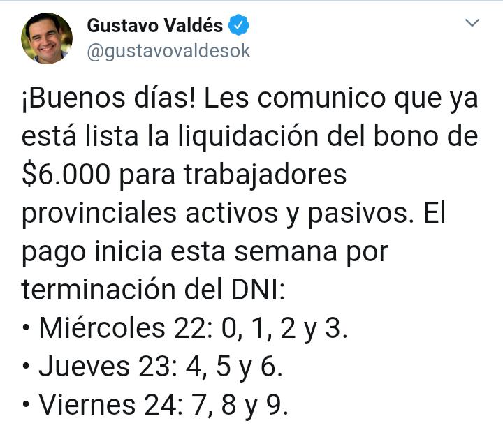 A través de su cuenta oficial de Twitter, el gobernador Gustavo Valdés brindo el detalle del cronograma de pago del bono de enero de $6.000 a los empleados públicos tanto activos como jubilados y pensionados.