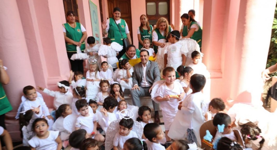 Esta mañana en Gobernación, niños vestidos de angelitos visitaron al titular del Ejecutivo Provincial, Gustavo Valdés, quien recibió con fervor y cariño al grupo de los CDI “Mitay Roga VII” –jardines N° 6 y 7 de los barrios Quilmes y Santa Marta- en representación de los 15 jardines municipales.