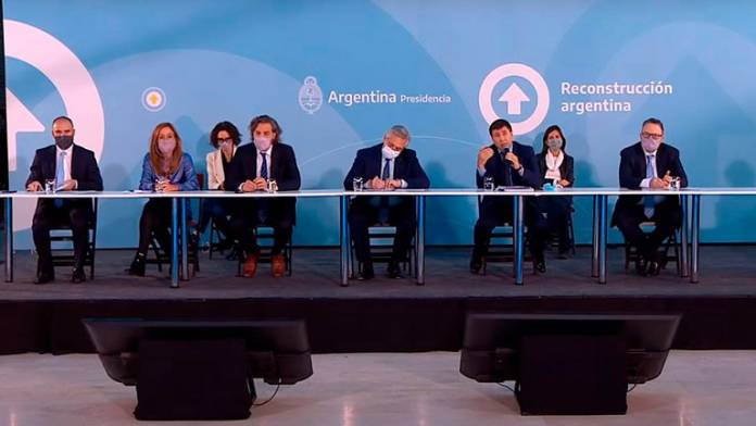 El presidente Fernández estuvo acompañado por Santiago Cafiero, jefe de Gabinete de la Nación; Martín Guzmán, ministro de Economía; Daniel Arroyo, ministro de Desarrollo Social; Matías Kulfas, ministro de Desarrollo Productivo; Cecilia Todesca, vicejefa de Gabinete; Fernanda Raverta, titular de ANSES; Victoria Tolosa Paz, presidenta del Consejo Nacional de Coordinación de Políticas Sociales; y Luisa Brumana, representante de UNICEF en Argentina.