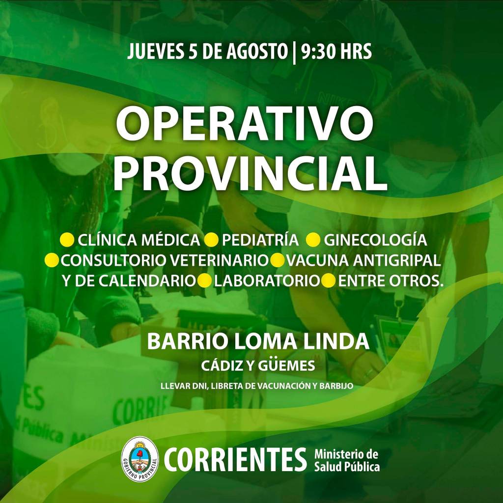 El Gobierno provincial informa que este jueves 5 de agosto, el Ministerio de Salud realizará un megaoperativo de salud en el barrio Loma Linda de Capital, entre las calles Cádiz y Güemes.