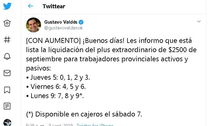 “¡Buenos días! Les informo que está lista la liquidación del plus extraordinario de $2500 de septiembre para trabajadores provinciales activos y pasivos:  Jueves 5: 0, 1, 2 y 3.  Viernes 6: 4, 5 y 6.  Lunes 9: 7, 8 y 9*. (*) Disponible en cajeros el sábado 7”, escribió el gobernador Gustavo Valdés, vía twitter.