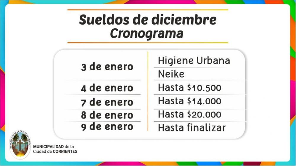 La Municipalidad de la ciudad de Corrientes informó que el jueves 3 arranca el pago a empleados municipales, inicia el cronograma Higiene Urbana y Neike, continúa el 4 de enero hasta 10.500