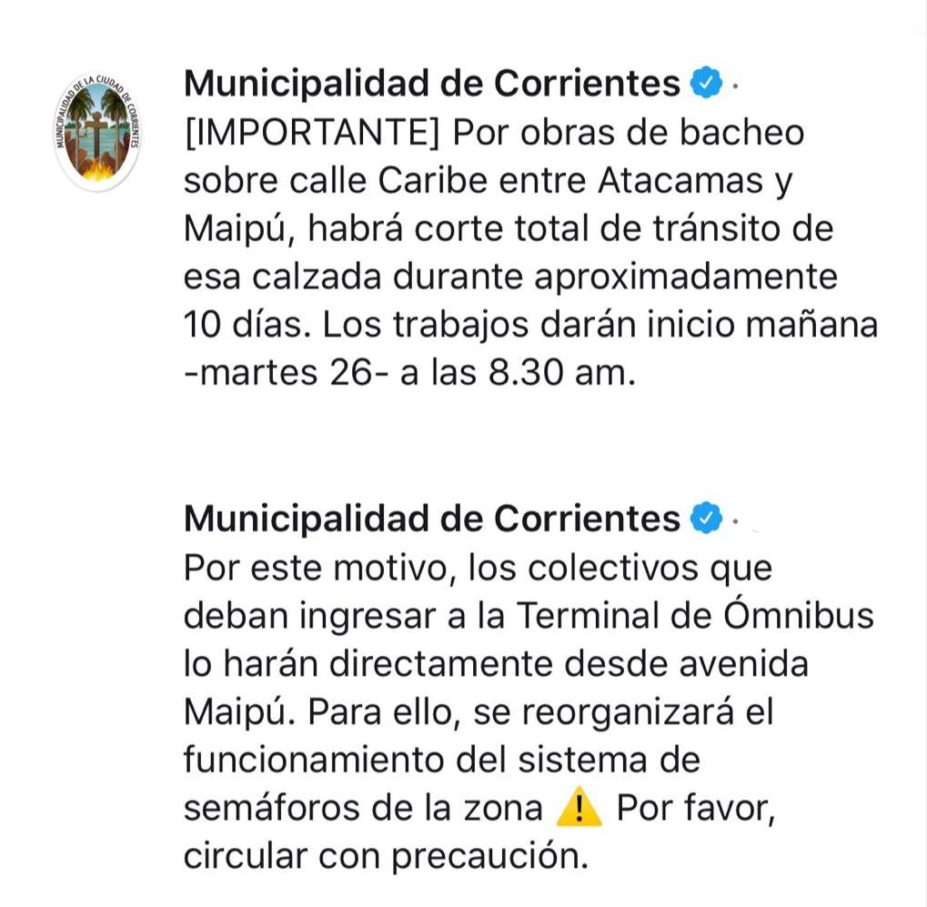 Por obras de bacheo sobre calle Caribe entre Atacamas y Maipú, habrá corte total del tránsito de esa calzada por aproximadamente 10 días.