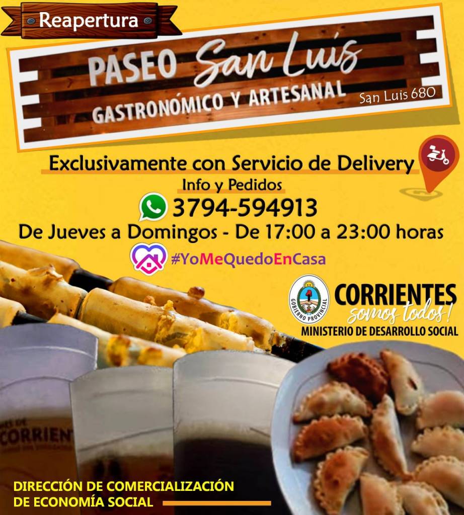 En medio de la pandemia por el Coronavirus COVID19 que azota al mundo entero y que Corrientes no es la excepción a esta enfermedad, el Paseo San Luis reabre sus puestas de manera delibery para pedidos de comidas y productos artesanales. Cabe recordar que el gobernador, Gustavo Valdés había inaugurado este espacio el 28 de febrero de este año antes de la declaración de la pandemia a nivel mundial, como iniciativa de la Dirección de Comercialización de la Economía Social dependiente de Desarrollo Social encabezada por Adán Gaya.