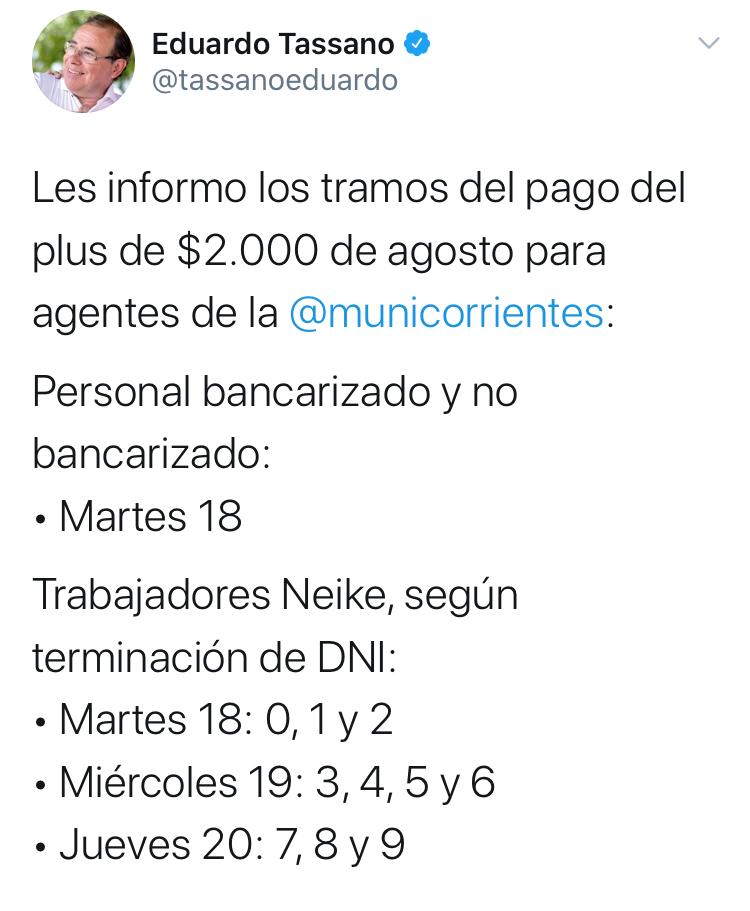 La Municipalidad de Corrientes efectivizará desde este martes 18 el pago del plus de 2.000 pesos para todo el personal (trabajadores Neike, contratados y planta permanente). El anuncio fue dado a conocer por el intendente Eduardo Tassano a través de su cuenta oficial de Twitter.