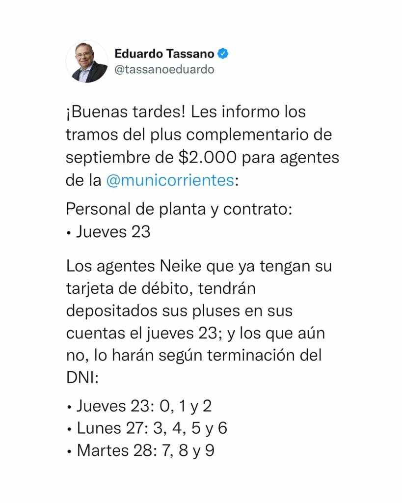 La Municipalidad de Corrientes efectivizará desde este jueves 23 el pago del plus complementario de 2.000 pesos para todo el personal (trabajadores Neike, contratados y planta permanente). El anuncio fue dado a conocer por el intendente Eduardo Tassano a través de sus redes sociales.