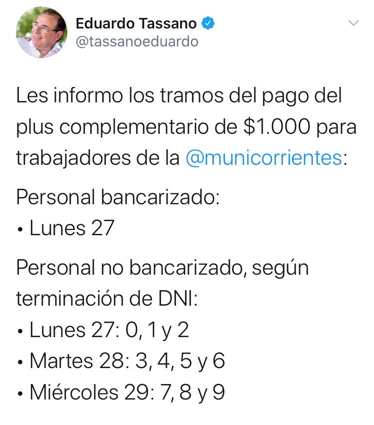 Tal como lo anunció el intendente Eduardo Tassano en su cuenta de Twitter, el pago de $ 1.000 arrancará el lunes 27, para los agentes bancarizados. A su vez, los que no están bancarizados cobrarán según terminación de DNI: el lunes, aquellos con documentos que finalicen en 0, 1 y 2; el martes 28, quienes tengan DNI terminados en 3, 4, 5 y 6; y el miércoles 29, los que tengan DNI que culminen en 7, 8 y 9. De acuerdo con lo anunciado por el intendente Eduardo Tassano a través de su cuenta oficial de Twitter, la Municipalidad de Corrientes efectivizará entre este lunes 27 y miércoles 29 el pago del plus complementario de 1.000 pesos para todo el personal. El cobro se efectuará de la siguiente manera: el lunes percibirán el plus complementario todos los trabajadores bancarizados, montos que serán depositados en sus respectivas cuentas. Asimismo, el pago para aquellos que no están bancarizados se subdividirá en tres días, de lunes a miércoles, según la terminación del número de Documento Nacional de Identidad (DNI). Así, los agentes con DNI finalizados en 0, 1 y 2, cobrarán el lunes 27; los que tengan DNI que terminen en 3, 4, 5 y 6, lo harán el martes 28; y quienes posean DNI que culminen en 7, 8 y 9, percibirán sus respectivos pluses complementarios el miércoles 29. En ese contexto, el intendente recordó que los agentes no bancarizados deberán dirigirse a la Caja Municipal de Préstamos (CMP), cuya sede central -ubicada en Brasil 1269- estará abierta de 8 a 12 y de 16 a 20. “El pago se hará en la Caja Municipal de Préstamos y se dividirá en tres días. De esta manera, evitaremos la aglomeración de personas, con el firme objetivo de seguir cuidándonos entre todos ante la pandemia del coronavirus”, señaló. “Reiteramos los pedidos de respeto del distanciamiento social y de las normas de higiene”, insistió Tassano, tras lo cual instó a los agentes municipales a continuar desenvolviéndose respetando los protocolos de prevención. “Vamos a salir de ésta todos juntos”, finalizó. |