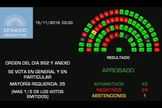 Con el apoyo de parte del peronismo, la votación fue de 45 votos a favor, 24 en contra y una abstención.
