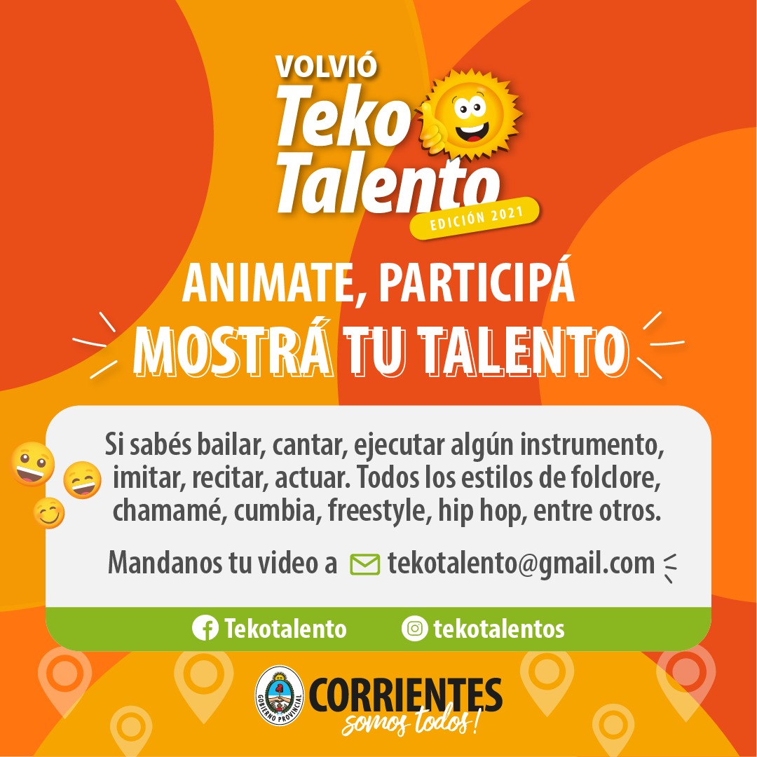 Hace más de cinco años el Teko Talento viene descubriendo grandes valores en materia de música, baile y canto. Por ello, una vez , todos los correntinos, sin límite de edad pueden participar de esta propuesta que como premio brinda la posibilidad de grabar su material a los ganadores, para las plataformas de Spotify y Youtube; además podrán participar en las diferentes transmisiones o eventos especiales que realice el Tekové Potî.