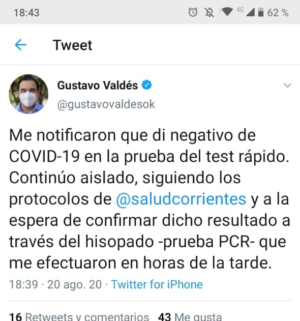 El mismo gobernador informó a través de su cuenta oficial de Twitter que dio negativo el test rápido de coronavirus que le realizaron en horas de la tarde.