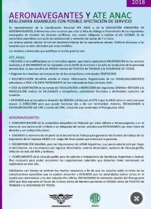 Los estatales de la Administración Nacional de Aviación Civil (ANAC) llevarán adelante asambleas en los aeropuertos del resto del país, para tratar una agenda de reclamos que incluye “pedidos por reincorporación de despedidos, repudio a prácticas anti-sindicales, recomposición salarial y rechazo a la sanción del presupuesto 2019”, entre otros.