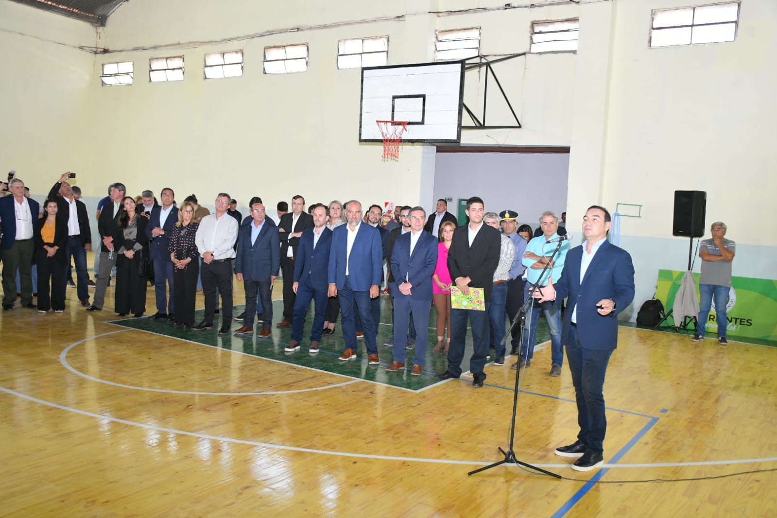 Continuando su visita a Goya, el gobernador Gustavo Valdés visitó este miércoles el Centro de Educación Física (CEF) N°9, donde realizó el corte de cintas de la cancha de parquet y la iluminación, además de entregar elementos deportivos a instituciones locales. “El Estado debe invertir en el deporte, por eso uno de nuestros objetivos es mejorar al menos cuatro centros de educación física en el interior”, manifestó, agregando que el deporte y la actividad física es uno de los ítems trazados en el Plan Estratégico Participativo 2030.