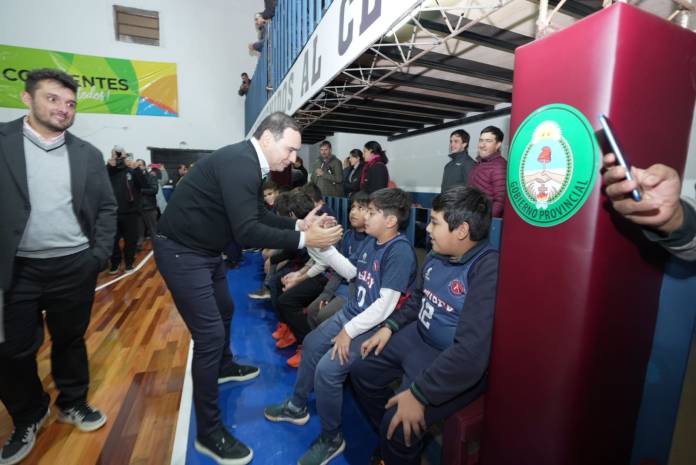 El gobernador Gustavo Valdés inauguró este jueves a la noche las nuevas instalaciones del Club Social y Deportivo “Renacimiento Aguapey” de la ciudad de Virasoro. Entre varias nuevas obras en el lugar, el piso de parquet fue la principal y el Mandatario provincial destacó que este tipo de infraestructura potencia el deporte, indicando que ello es política de Estado en su gestión. Agregó además que iguales obras se realizaron en muchos otros clubes de Corrientes, resaltando la presencia en este acto del presidente de la Asociación de Clubes de Básquet, Eduardo Tassano, máxima institución del básquet profesional de Argentina.
