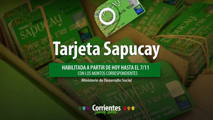 El Ministerio de Desarrollo Social del Gobierno de Corrientes, a cargo de Adán Gaya, informa a los beneficiarios del Programa, que las Tarjetas Sapucay se encuentran habilitadas desde hoy martes 20 de octubre, hasta el 7 de noviembre, con los montos correspondientes.