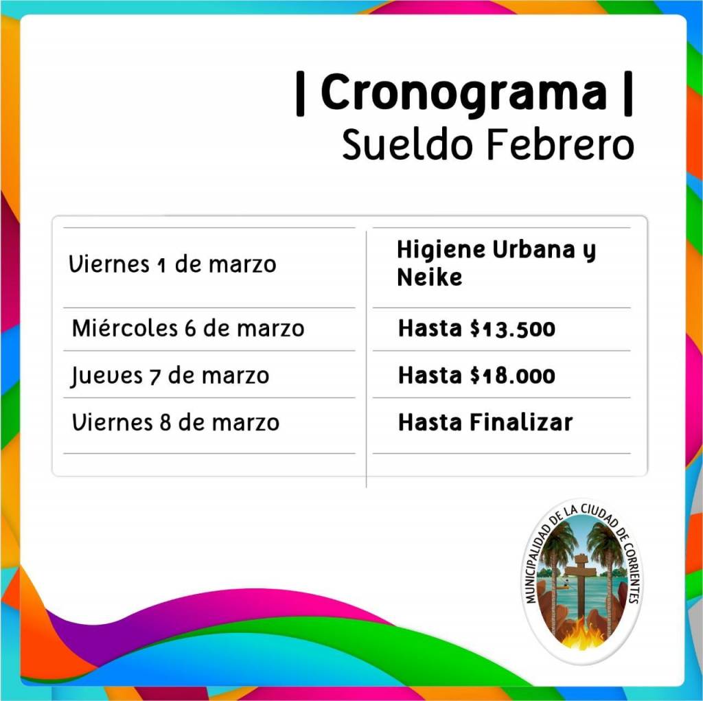 Desde la Municipalidad de la ciudad de Corrientes informaron que este viernes 1 de marzo arranca el pago de haberes del mes de febrero a los empleados municipales.