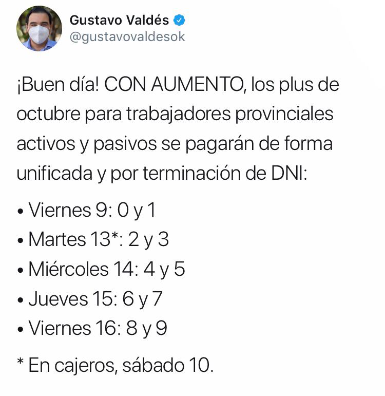 A través de su cuenta de twitter @gustavovaldesok, el gobernador Gustavo Valdés confirmó y dio detalles del cronograma de liquidación del adicional con aumento que pasaría a $12.650 correspondiente a este mes. La Provincia comienza abonar este viernes 9 a los agentes de la administración pública correntina, tanto a activos, jubilados y pensionados.