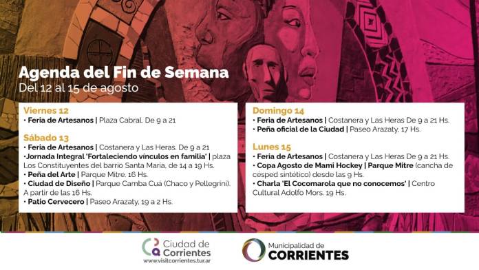 En un fin de semana extendido debido al feriado nacional del próximo lunes 15, la Municipalidad de Corrientes prepara múltiples propuestas para disfrutar en familia o con amigos. Como es habitual, los artesanos ofrecerán sus productos en dos puntos estratégicos de la ciudad, todos los viernes en la plaza Cabral, en tanto que el sábado, domingo y lunes estarán en costanera Juan Pablo II y Las Heras. De 9 a 21, en los respectivos lugares, se podrán adquirir trabajos manufacturados a buen precio y de excelente calidad. Además, habrá stands gastronómicos, dulces regionales y de floricultura.