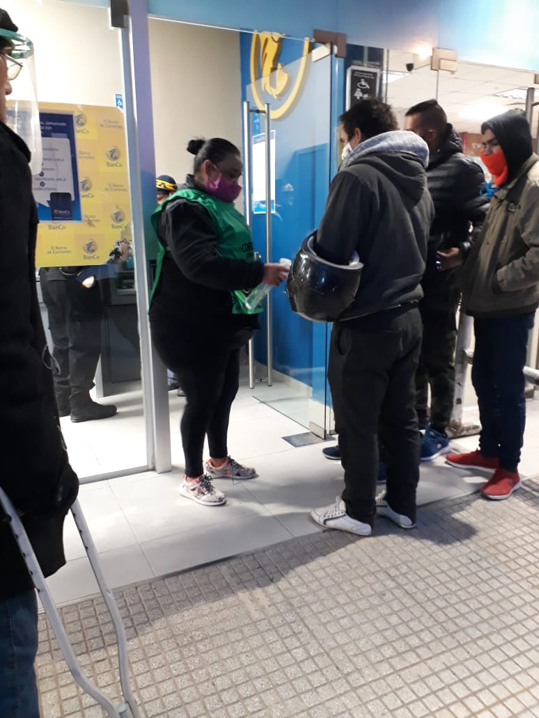 Por su parte la Subsecretaria de Desarrollo humano e Igualdad a cargo de la Escribana Andrea Giotta también llevó a cabo sanitización y distribución de desayuno en el cajero de Tte Ibáñez.