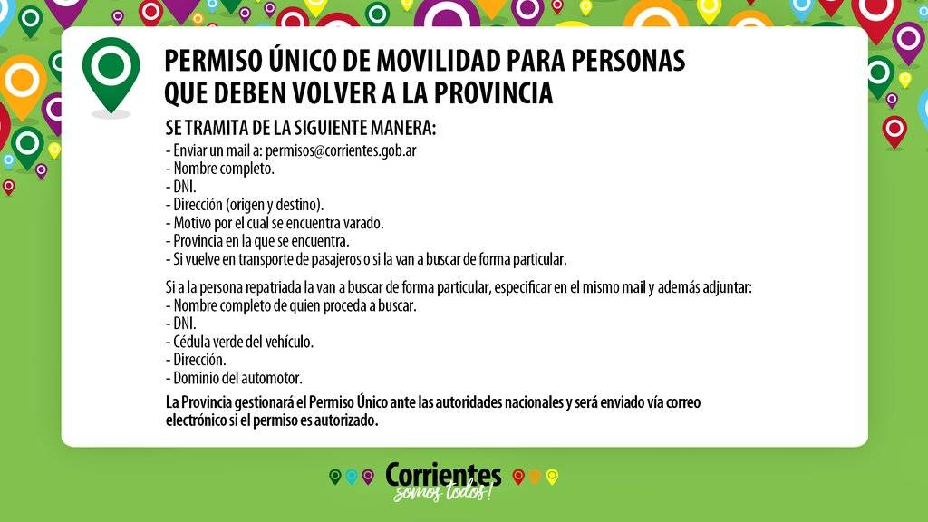 Para ello deberán enviar un correo electrónico a la dirección de permisos@corrientes.gob.ar, que contenga nombre completo del solicitante, además del número de DNI, dirección –origen y destino-, motivo por el cual se encuentra varado, provincia en la que se encuentra y por último, aclarar si su regreso lo realizará mediante transporte de pasajeros o de forma particular.