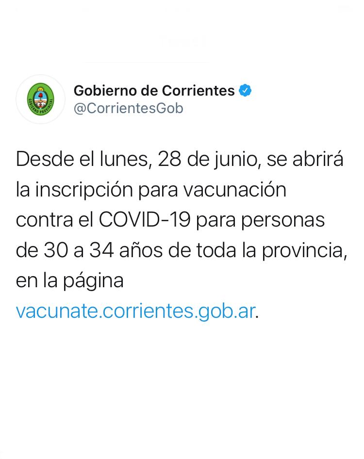 El Gobierno de Corrientes habilitará desde este lunes 28 la inscripción para la vacunación contra el Covid-19 para personas de 30 a 34 años de toda la provincia. Será a través de la página www.vacunate.corrientes.gob.ar.