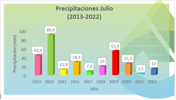 En lo que va del año, hasta el mes de informe, la precipitación acumulada asciende al valor de 662,2 milímetros. En los gráficos elaborados por la gerencia de Ingeniería del ICAA se observó que el pasado mes de julio es el cuarto mes con menor registro de precipitación en la serie de datos comprendida del 2013-2022.