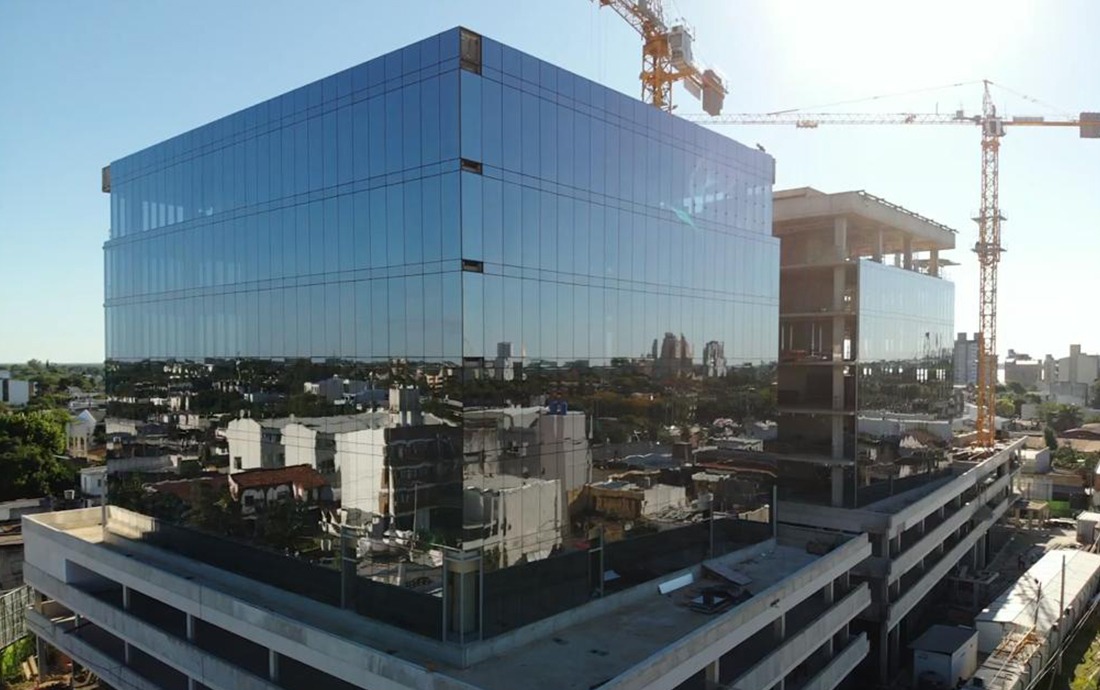 Se desarrolló la construcción con pisos técnicos, alfombra modular, pisos y revestimientos de granito en palieres y planta baja, cielos rasos acústicos, interiores de madera natural, control inteligente de las instalaciones, colectores solares, terrazas absorbentes, doble vidrio en el Courtain wall y respaldos de grupos electrógenos para todo el edificio.