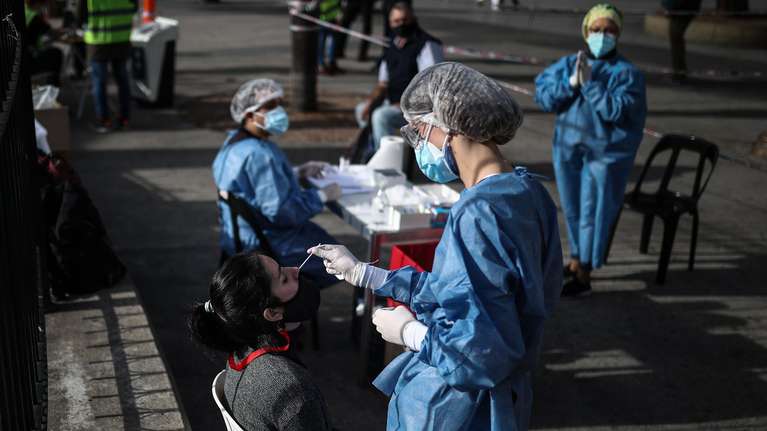 Un hisopado en uno de los centros de testeo móviles sobre coronavirus en una plaza de la Ciudad de Buenos Aires. (Foto: EFE/Juan Ignacio Roncoroni)