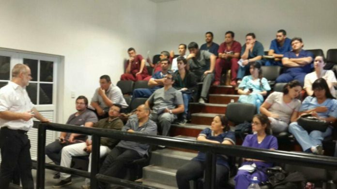La capacitación, que tuvo lugar el lunes y martes, se desarrolló en el hospital de Clínicas de la Facultad bajo la modalidad teórico-técnico y taller práctico. Los disertantes fueron Javier Brynkier (médico veterinario de la UBA) y Hernán Lampuri (ingeniero del INTI). Asistieron veterinarios de Corrientes, Chaco, Misiones, Salta y Paraguay.