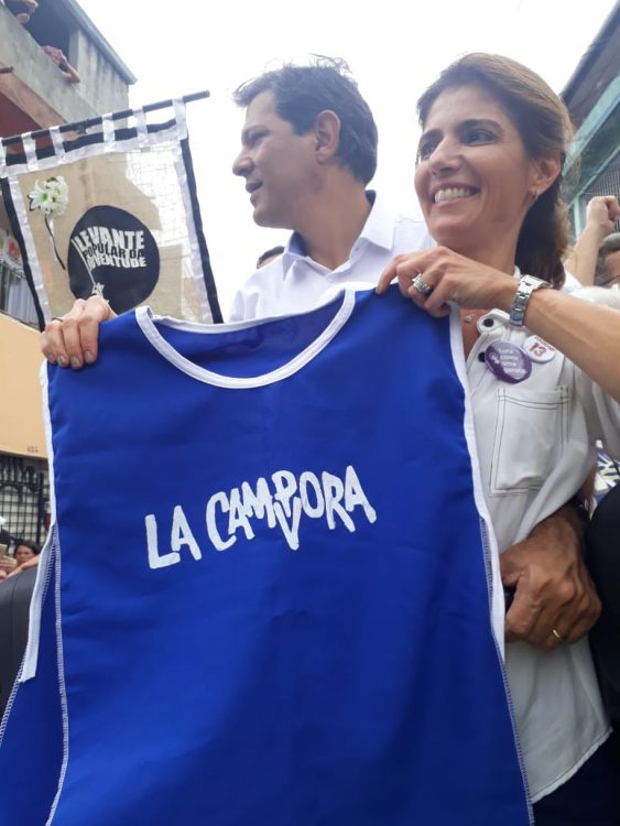 Durante la “caminata por la paz” con la que el candidato del PT brasileño concluyó su campaña, un grupo de argentinos le alcanzó una remera de La Cámpora a Ana Estela, esposa del candidato, quien posó con ella para las fotos.