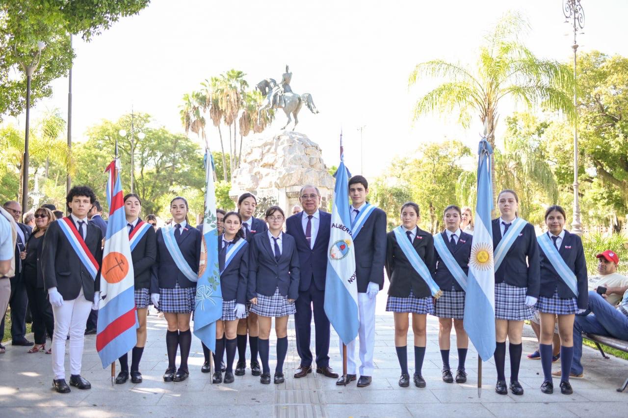 Dicho acto protocolar inició con el izamiento del Pabellón Nacional a cargo de la Guardia de Honor Cazadores Correntinos. Luego se entonaron las estrofas del Himno Nacional Argentino, seguido por un minuto de silencio, y posteriormente se procedió a la colocación de ofrendas florales frente al busto del Libertador.