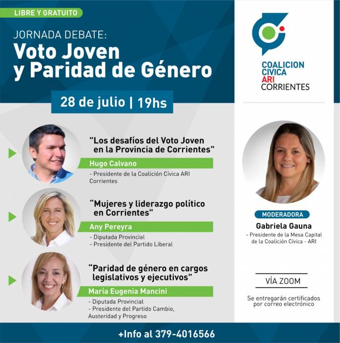 La charla tendrá como moderadora a la presidente de la Mesa Capital de la Coalición Cívica ARI, Gabriela Gauna y estará estructurada en tres ejes: Calvano hablará sobre “Los desafíos del Voto Joven en la Provincia de Corrientes”; Pereyra se explayará en “Mujeres y liderazgo político en Corrientes” y Mancini abordará “Paridad de género en cargos legislativos y ejecutivos”. Luego, se abrirá un espacio de diálogo y debate con los participantes.
