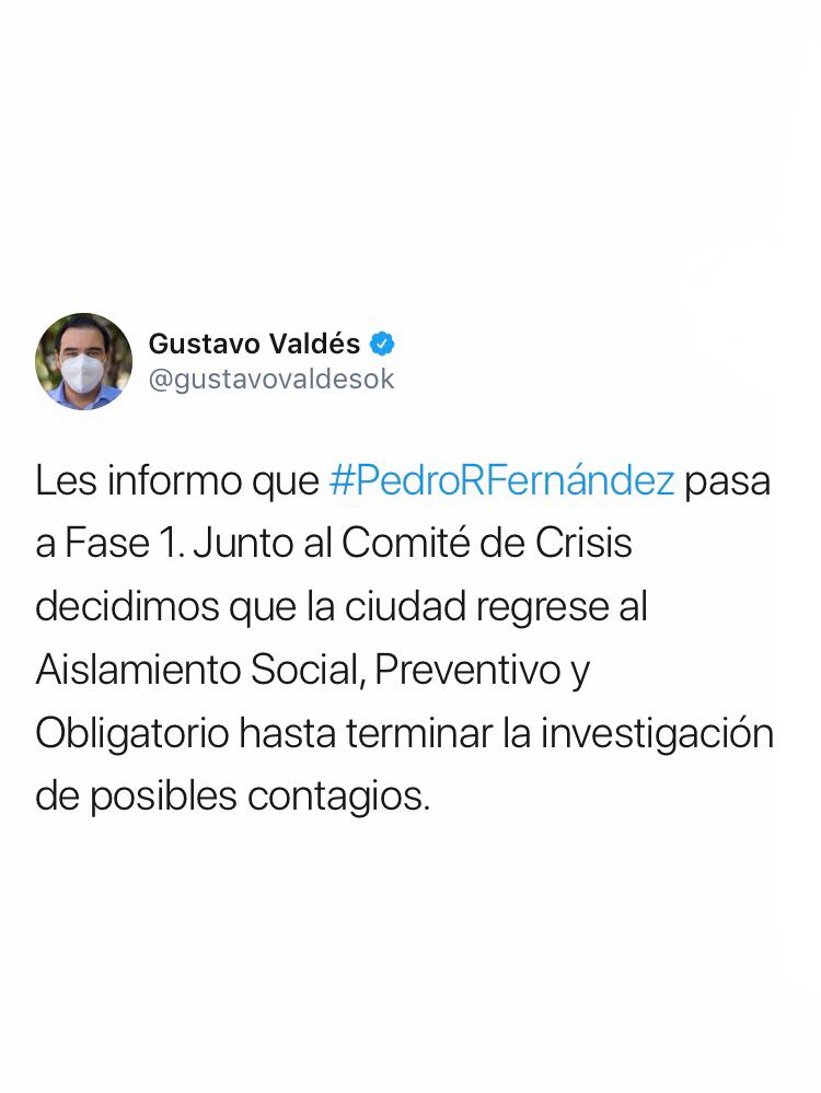 El gobernador de la provincia, Gustavo Valdés comunicó a través de Twitter que la localidad de Pedro R. Fernández –conocida también como Mantilla- pasará a Fase 1. “Junto al Comité de Crisis decidimos que la ciudad regrese al Aislamiento Social, Preventivo y Obligatorio hasta terminar la investigación de posibles contagios”, argumentó.
