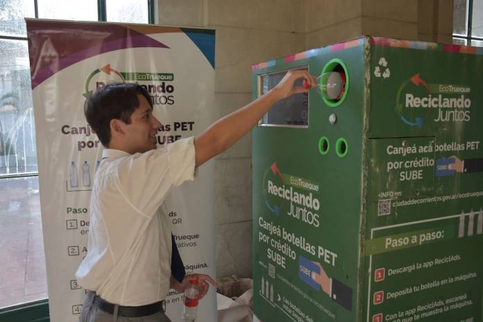 El dispositivo de la Municipalidad que permite intercambiar botellas PET por crédito para la tarjeta de transporte urbano estuvo esta semana en el colegio General San Martín, por la mañana, y la escuela secundaria Manuel Belgrano, por la tarde. Además, se realizaron charlas para promover que los estudiantes cuiden el ambiente e impulsar la economía circular. La Municipalidad de Corrientes continúa promoviendo una Ciudad Sustentable para el pleno desarrollo de los vecinos, sin descuidar la protección ambiental, el desarrollo social y el crecimiento económico. Una de las herramientas utilizadas es la máquina de Eco-trueque, que permite intercambiar botellas PET por crédito para la tarjeta SUBE.