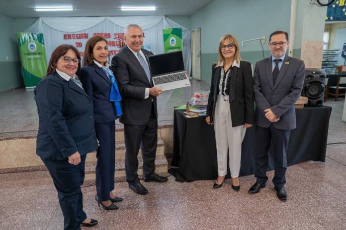 La ministra de Educación, Práxedes López, y el embajador de Estados Unidos en la Argentina, Marc Stanley, visitaron esta mañana la Escuela N.º 404 “Dr. Eduardo Wilde”, y entregaron equipamiento, parlantes, laptops, libros de cuento en inglés y sets de arte, en el marco de las celebraciones por el ducentésimo aniversario de las relaciones diplomáticas entre Argentina y Estados Unidos.