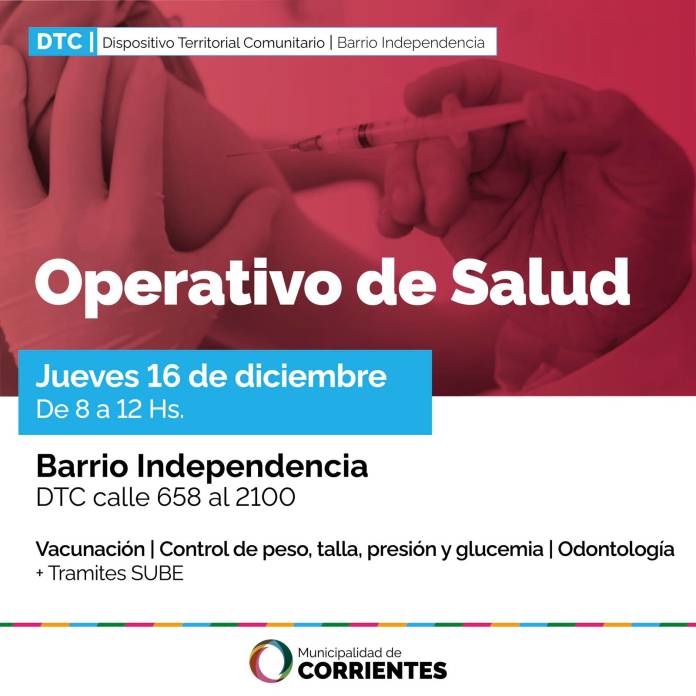 Con atenciones y diversas prestaciones gratuitas, la Municipalidad de Corrientes acercará este jueves un operativo de salud en el Dispositivo Territorial Comunitario (DTC) del barrio Independencia.