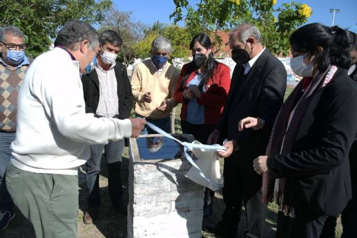 El viceintendente Emilio Lanari encabezó el acto en la plaza barrio Víctor Colas, en el marco del 40º aniversario de la Guerra de Malvinas, donde se repuso una placa en honor al excombatiente Eladio Ramón Galarza, quien estuvo presente durante el reconocimiento.