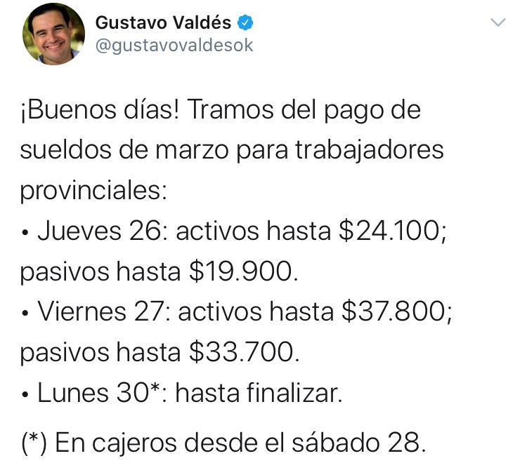 El gobernador, Gustavo Valdés anunció en su cuenta de Twitter el cronograma de pago de sueldos para trabajadores provinciales. Los mismos tendrán el incremento salarial informado con anterioridad y se pagarán desde el jueves 26 hasta el lunes 30.
