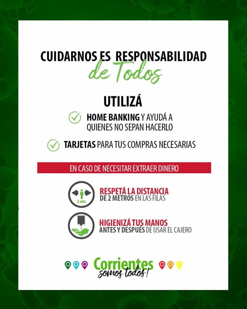 El Gobierno de Corrientes recuerda que la totalidad de los bancos se encuentran cerrados por la epidemia de dengue y coronavirus. Por ello recomienda el uso de tarjeta de débito y medios electrónicos -como Homebanking- para realizar compras y pagos, ayudando a quienes no sepan usar esas alternativas.