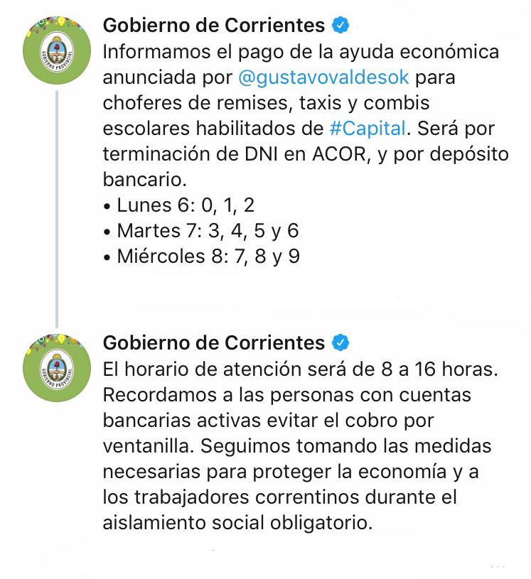 Es así que el cronograma establecido para el respectivo pago es por terminación de documentos: 0, 1, 2 este lunes; 3, 4, 5 el martes y 7,8, 9 el miércoles. Cobrarán este subsidio unos 1.680 chóferes de vehículos con habilitación municipal y el lugar de pago para quienes no posean caja de ahorro será el edificio de ACOR, sito en avenida La Paz 2440, en el horario de de 8 a 16 hs. De esta forma, se evita la aglomeración de personas en el Banco de Corrientes que en los próximos días se aboca únicamente a jubilados, pensionados y otros beneficios sociales.