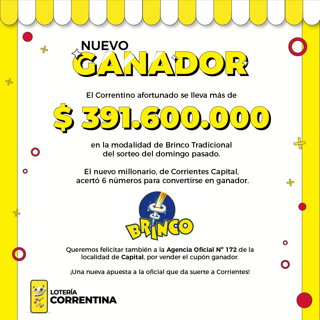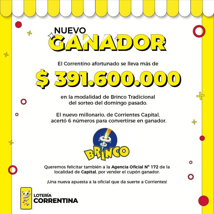 Durante el último sorteo de Brinco, la suerte sonrió nuevamente en Corrientes. Un afortunado apostador con 6 aciertos se adjudicó el impresionante premio total del Brinco Tradicional, llevándose más de $391.600.000.