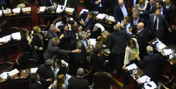 Nicolás del Caño se acercó al atril de la presidencia para reiterar el pedido de cuarto intermedio y lo acompañaron otra decena de diputados de distintos partidos de la oposición. A continuación, otros legisladores del kirchnerismo, como Juan Cabandié y Daniel Filmus, se acercaron a la banca del oficialista Nicolás Massot, y se registraron algunos empujones e insultos entre los legisladores.