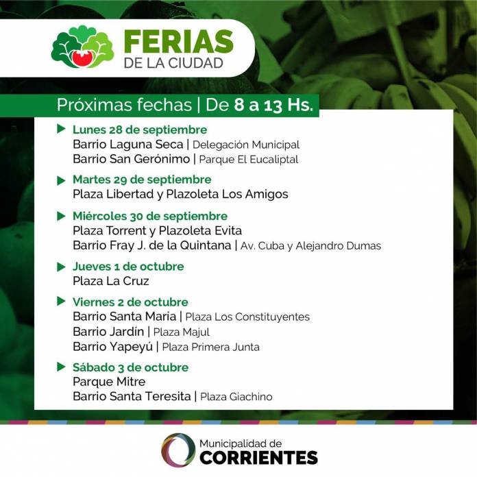 Desde el lunes al sábado próximo los feriantes estarán de 8 a 13 en los barrios Laguna Seca, San Gerónimo, Libertad, La Rosada, Centro, Berón de Astrada, Fray de la Quintana, La Cruz, Santa María, Jardín, Yapeyú, Aldana y Santa Teresita. Garantía de productos frescos de primera calidad a precios convenientes.
