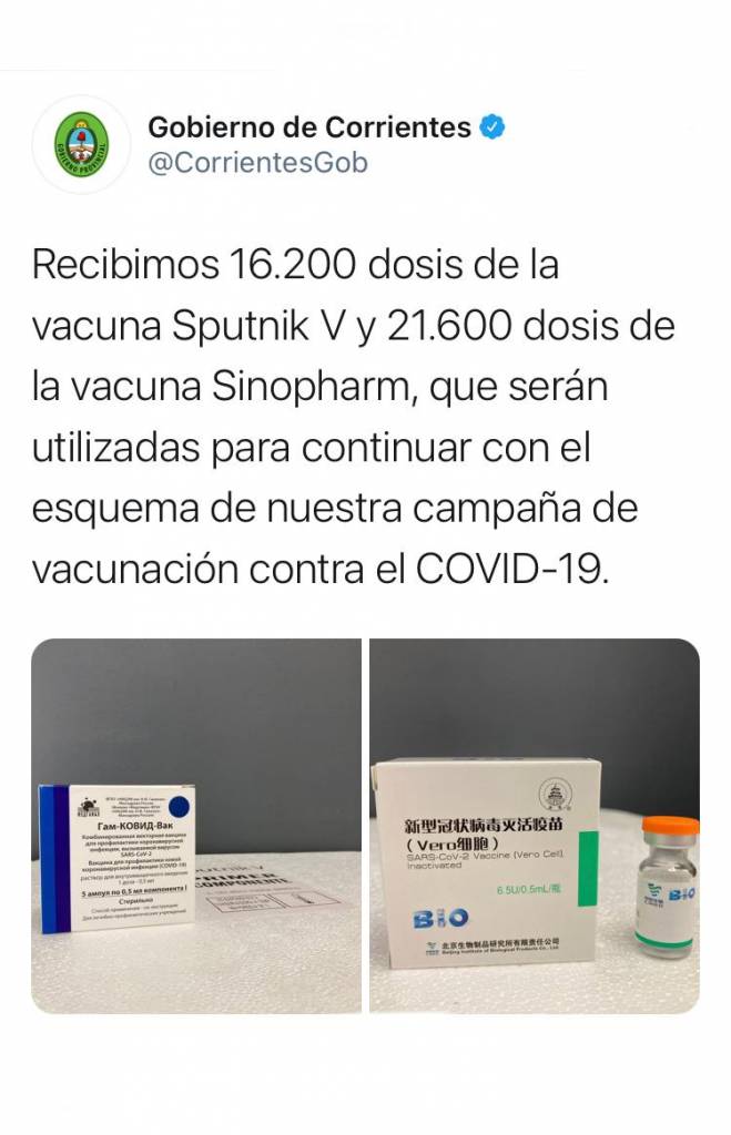 El Gobierno de Corrientes anunció por medio del Twitter oficial (@CorrientesGob), que llegaron 16.200 dosis de la vacuna Sputnik V y 21.600 de la vacuna Sinopharm, ambas corresponden a la primera dosis y se utilizarán para continuar con el esquema de vacunación contra el COVID-19.