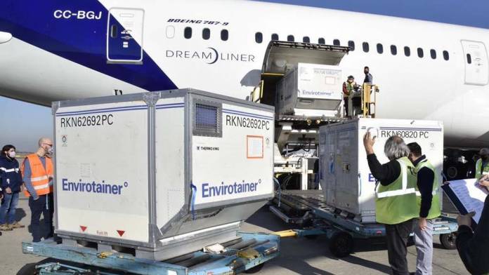 El vuelo LA 8585 de la empresa Latam Chile, proveniente de la ciudad de Miami, aterrizó en el aeropuerto de Ezeiza a las 14.59 y completó así un lote semanal de 2.320.500 del antígeno desarrollado en conjunto por el laboratorio sueco y la Universidad de Oxford.