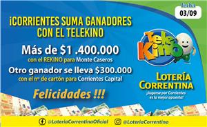 ¡Corrientes suma ganadores con el Telekino!  Esta vez el afortunado se lleva  $1.461.102 del premio a los 15 aciertos del Rekino, en el sorteo Nº2287. El cartón fue vendido por la Agencia Oficial Nº160 de la localidad de Monte Caseros. Además, otro ganador se lleva $300.000 en premios al número de cartón 0.246.590, vendido en la Agencia Oficial Nº 200 de Corrientes Capital.