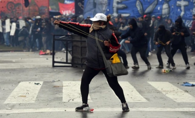 Uno de los manifestantes con una gomera en el medio de los incidentes