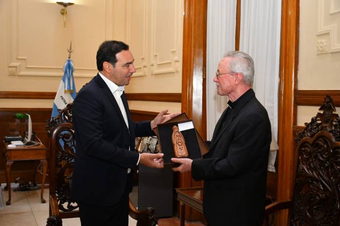 Gustavo Valdés recibió este mediodía en su despacho oficial al arzobispo de Corrientes, quien posteriormente realizó una invocación religiosa en el Salón Amarillo, con la presencia de funcionarios y personal de Gobernación.
