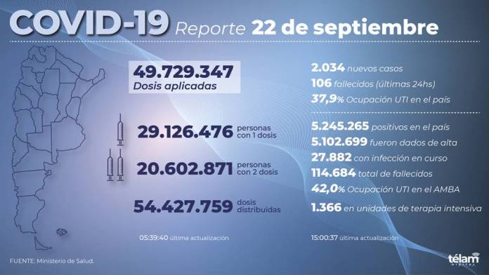 Otras 106 personas murieron y 2.034 fueron reportadas con coronavirus en las últimas 24 horas en la Argentina, con lo que suman 114.684 los fallecidos registrados oficialmente a nivel nacional y 5.245.265 los contagiados desde el inicio de la pandemia, informó el Ministerio de Salud.
